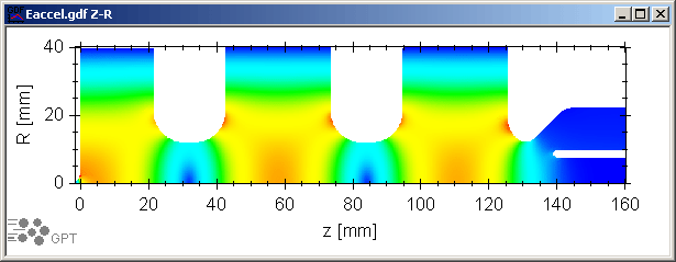 GPTwin color-density plot of the electric field strength in the TU/e 2.5 cell rf-cavity. The TM-profile was calculated with Superfish and automatically imported into GPT as a 2D cylindrical symmetric field-map. Results of particle tracking simulations through this structure are shown here.